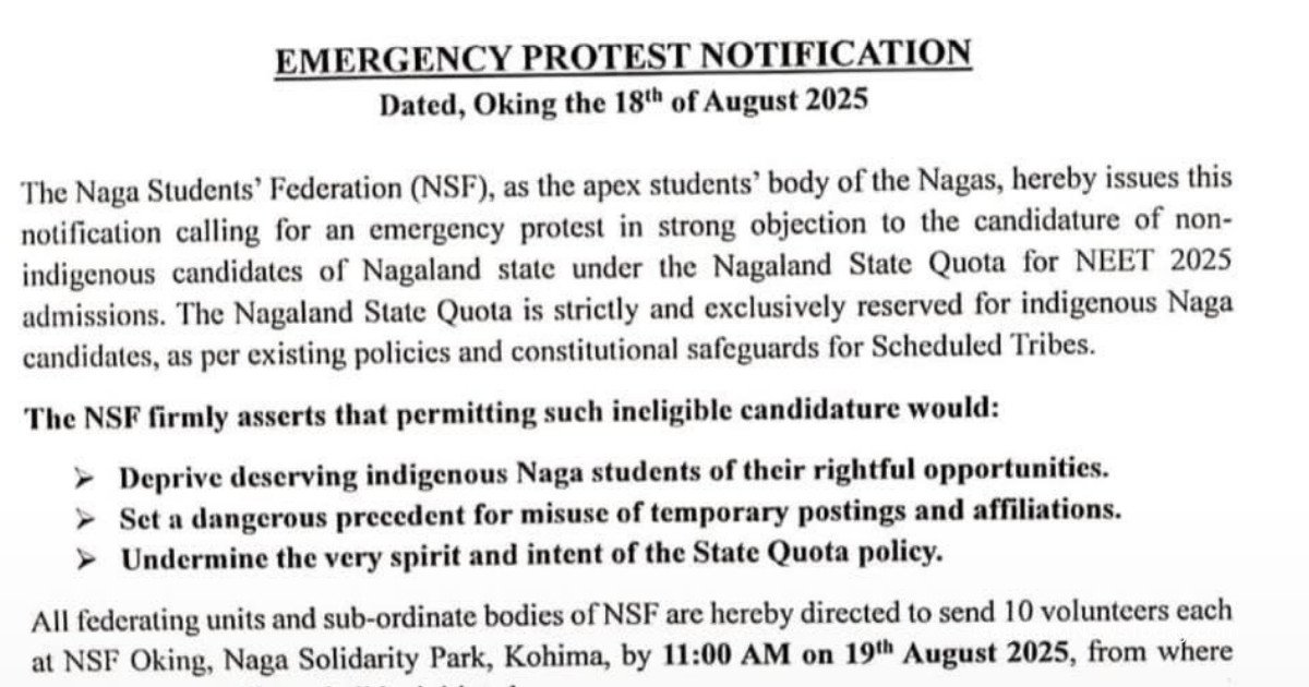 The Naga Students Federation (NSF) has called for an emergency protest in Kohima on August 19, 2025, in opposition to the alleged candidature of non-indigenous students under the Nagaland State Quota for NEET 2025 admissions. The Federation, which serves as the apex students’ body of the Nagas, warned that such inclusion is a direct violation of the rights reserved for indigenous Naga candidates.