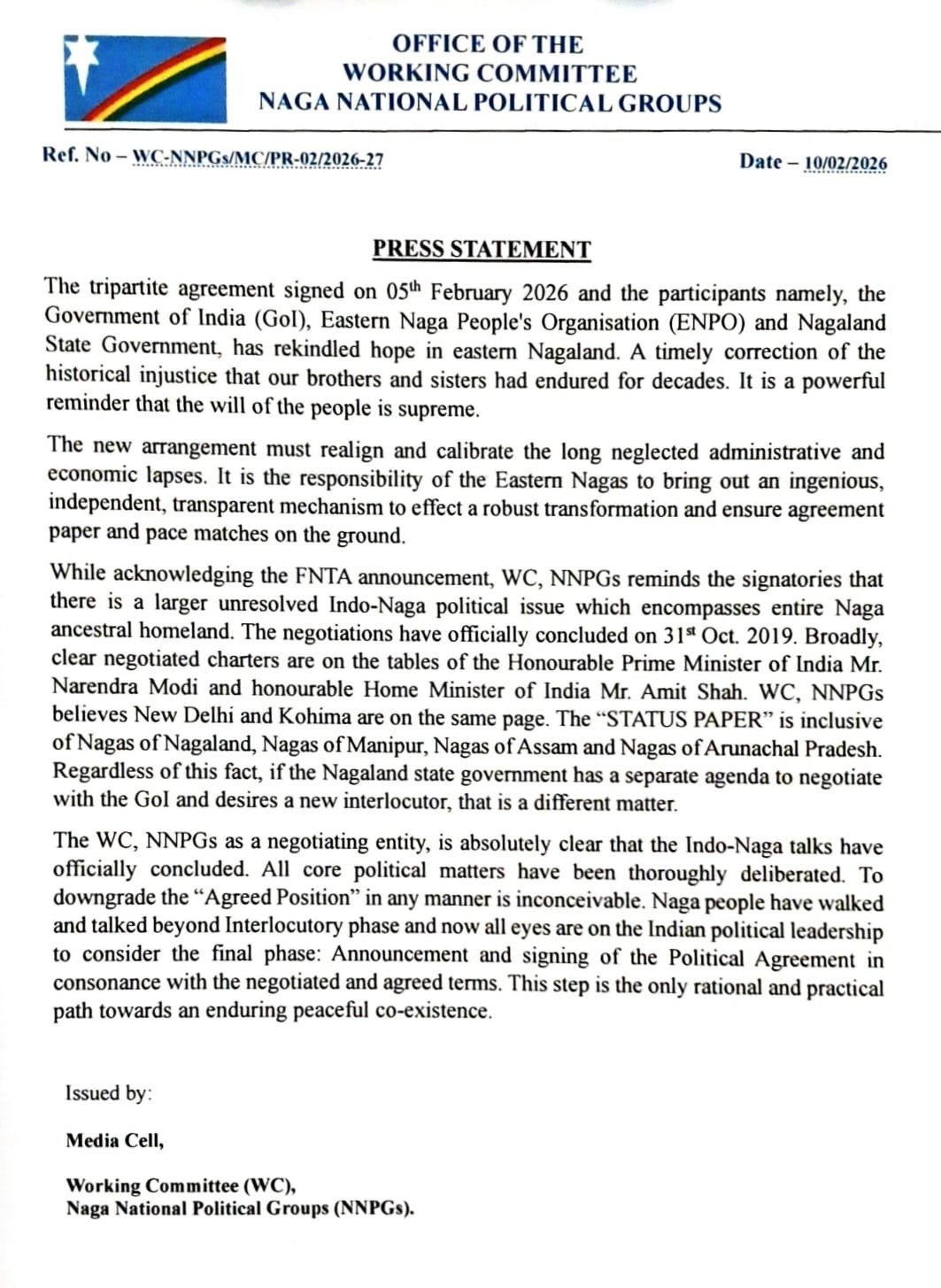 The NNPGs Press Statement issued by the Working Committee (WC) of the Naga National Political Groups (NNPGs) on February 10, 2026, welcomed the February 5 tripartite agreement signed between the Government of India, the Eastern Naga People’s Organisation (ENPO), and the Nagaland State Government, while reiterating that the broader Indo-Naga talks have already concluded and now await final political endorsement.