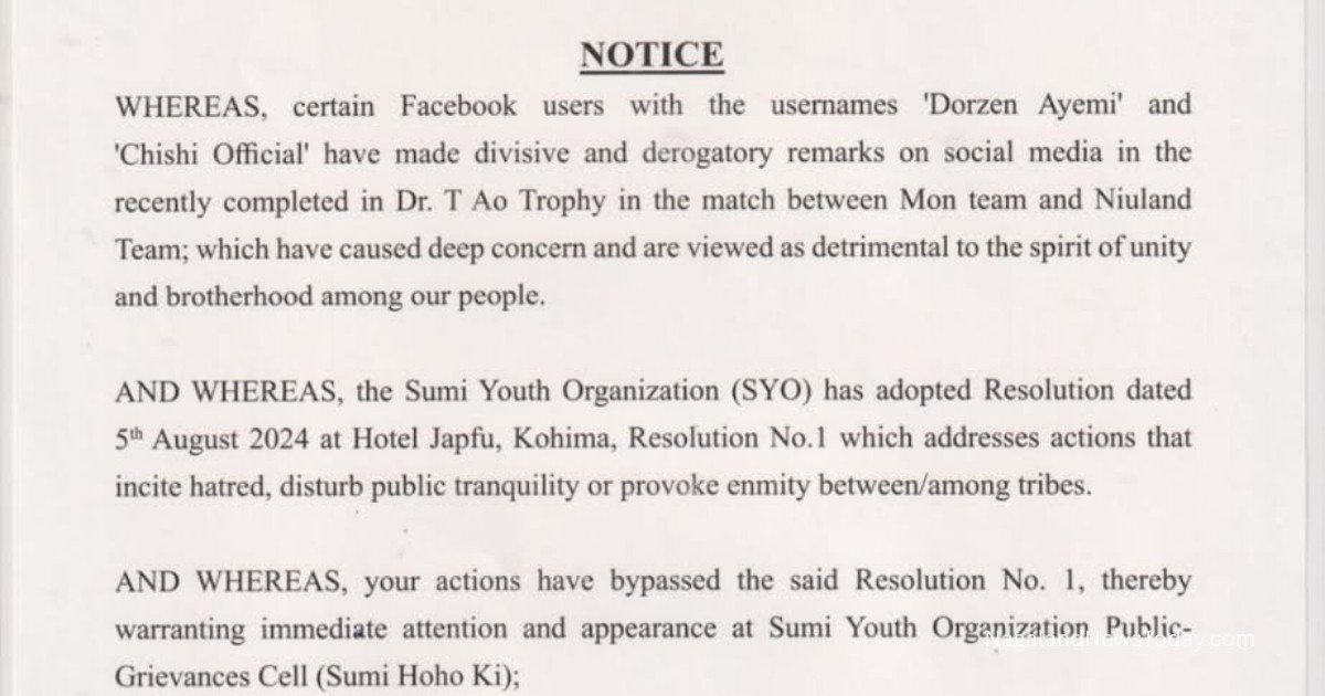 The Sümi Youth Organization (SYO) has issued an official notice against two Facebook users, identified by the usernames ‘Dorzen Ayemi’ and ‘Chishi Official’, for allegedly making divisive and derogatory remarks on social media related to the recently concluded Dr. T Ao Trophy match between Mon team and Niuland team.