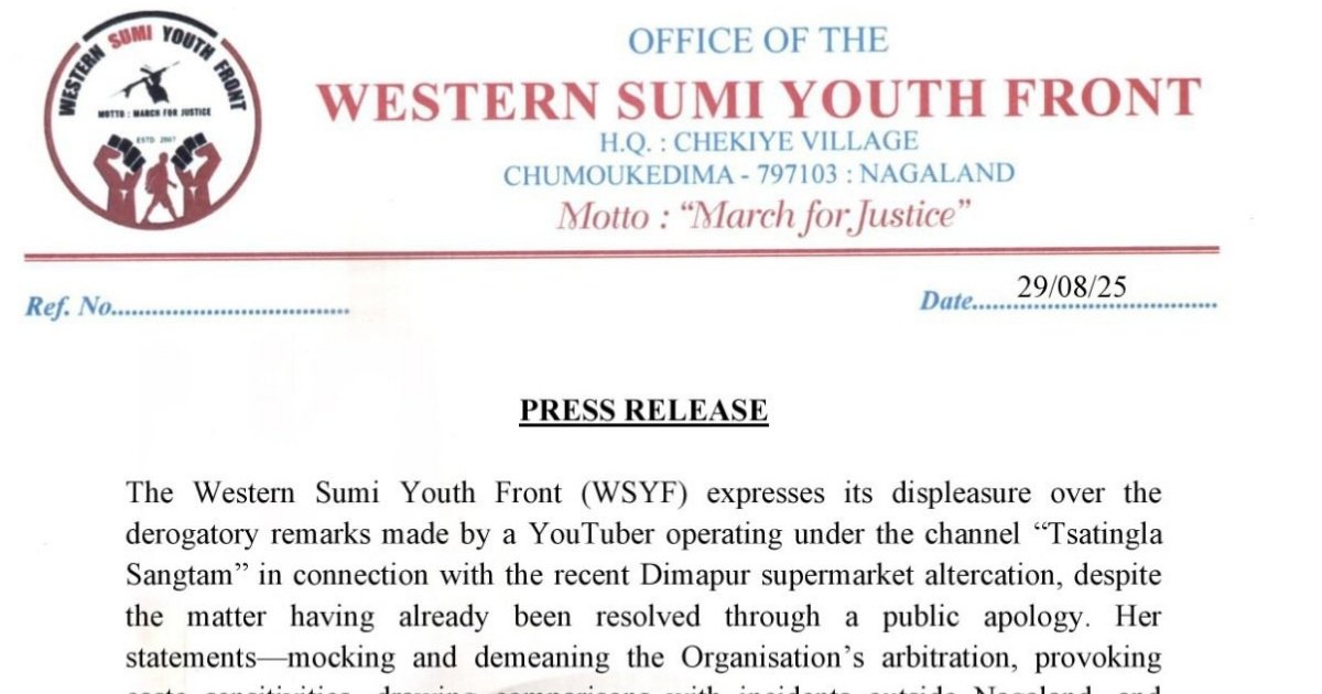 The Western Sumi Youth Front (WSYF) has publicly condemned derogatory remarks made by a YouTuber operating under the channel name “Tsatingla Sangtam.” This was in connection with a recent altercation at a Dimapur supermarket. According to the WSYF, these comments were made despite the matter already being resolved through a public apology. The organization describes the statements as mocking and demeaning to WSYF’s arbitration process. Moreover, they provoked caste sensitivities and compared the incident to cases outside Nagaland. These actions are described as deeply disrespectful and misleading to the Sumi community.