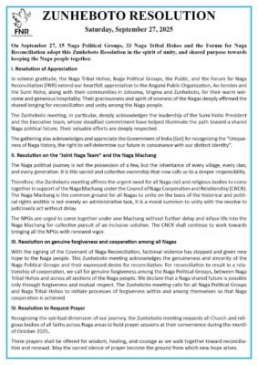 Acknowledging the spiritual dimension of the journey, the resolution appealed to churches and religious institutions across Nagaland to hold prayer sessions throughout October 2025. These prayers are meant to seek wisdom, courage, and healing as the Naga people move forward together in reconciliation and renewal.